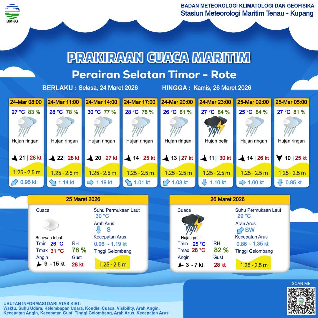24 Mar 26, 22.00 16 jam kedepan | Utara 10 kt Gust Peningkatan kecepatan angin yang singkat dan tiba-tiba : 25 kt | 2.1 m Sedang | Selatan 0.9 Knots | 27 °C | 80 % | |