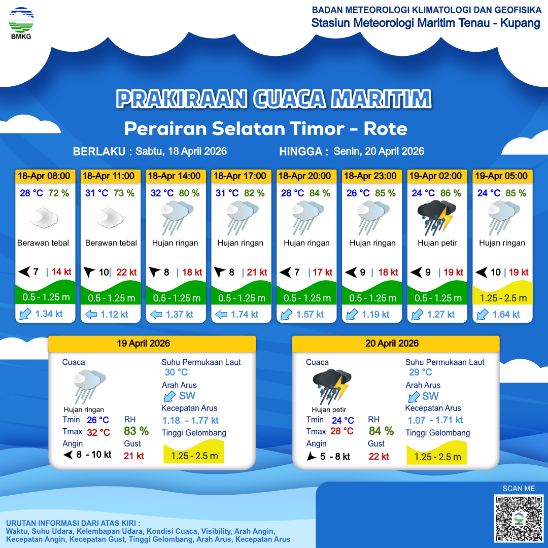 17 Apr 26, 08.00 2 jam kedepan | Timur 8 kt Gust Peningkatan kecepatan angin yang singkat dan tiba-tiba : 20 kt | 1 m Rendah | Barat 1.5 Knots | 30 °C | 66 % | |