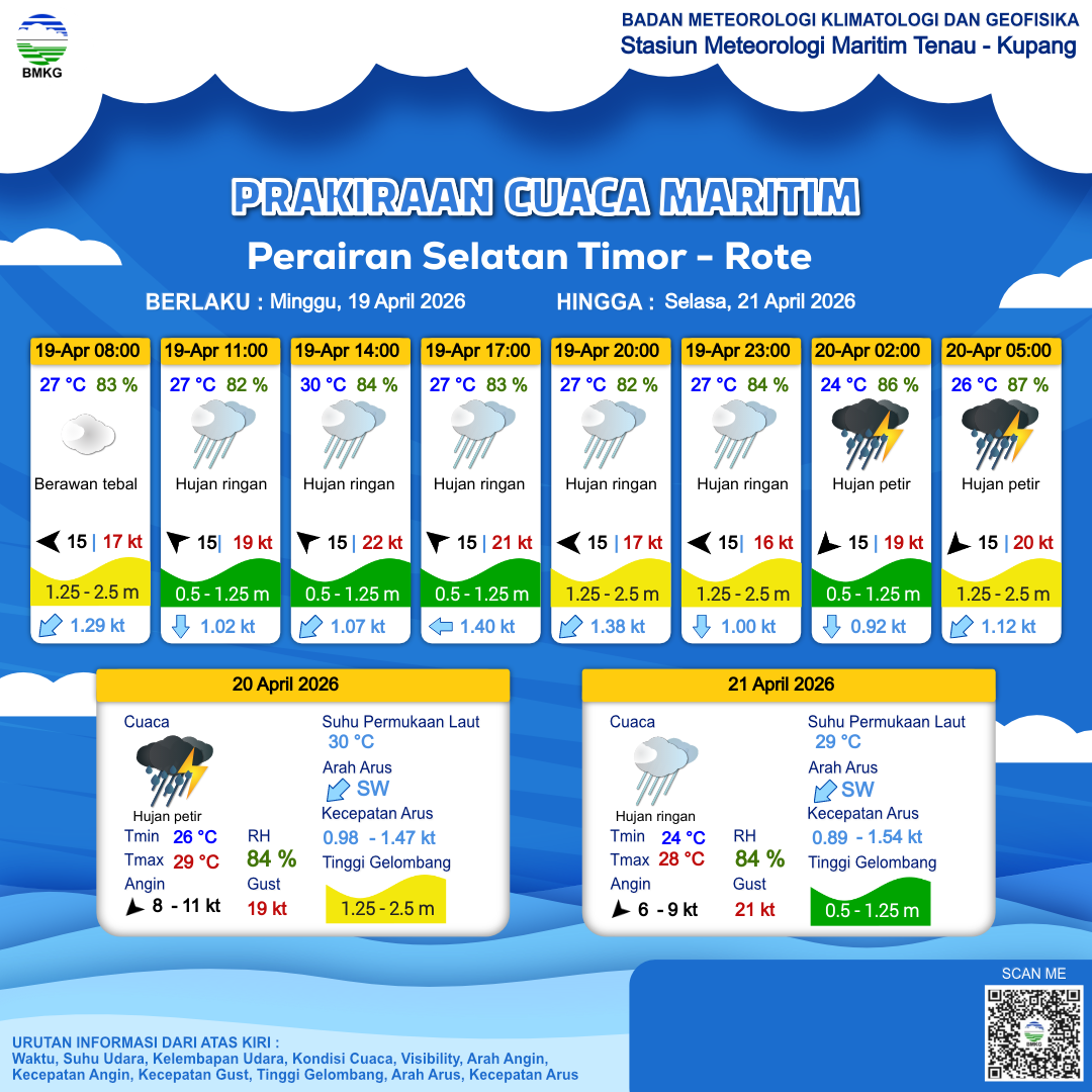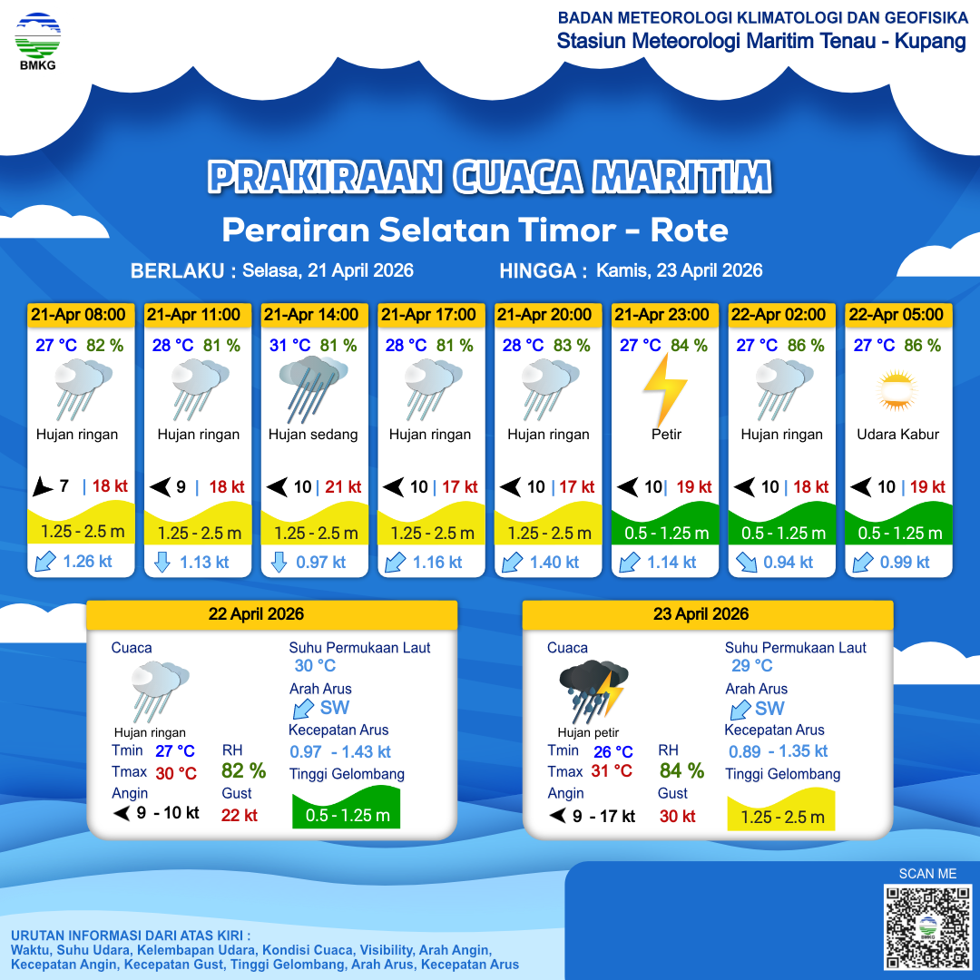 21 Apr 26, 06.00 24 jam kedepan | Timur 9 kt Gust Peningkatan kecepatan angin yang singkat dan tiba-tiba : 21 kt | 1 m Rendah | Barat Daya 0.9 Knots | 28 °C | 82 % | |