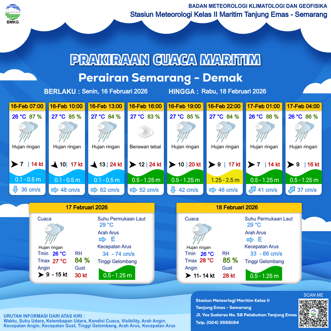 16 Feb 26, 23.00 6 jam kedepan | Barat 9 kt Gust Peningkatan kecepatan angin yang singkat dan tiba-tiba : 17 kt | 0.6 m Rendah | Timur 34.0 cm/s | 26 °C | 85 % |
