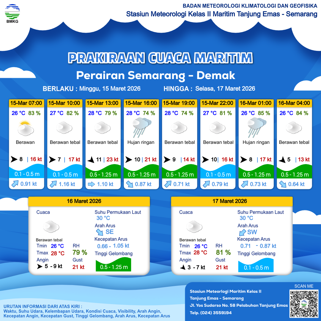 15 Mar 26, 21.00 3 jam kedepan | Berawan Tebal | Barat Laut 5 kt Gust Peningkatan kecepatan angin yang singkat dan tiba-tiba : 13 kt | | | 26 °C | 84 % |