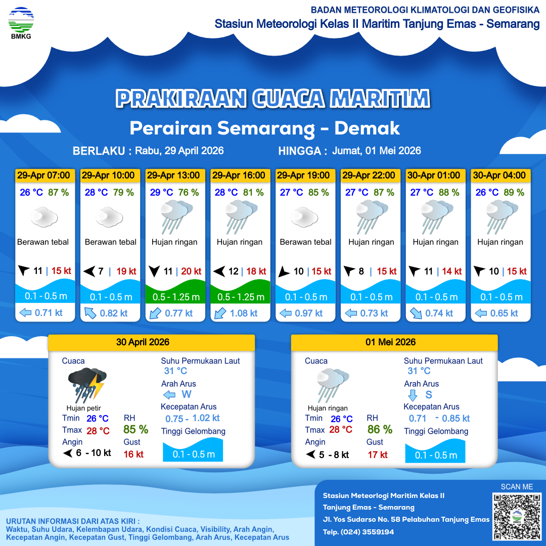 29 Apr 26, 06.00 2 jam kedepan | Utara 11 kt Gust Peningkatan kecepatan angin yang singkat dan tiba-tiba : 20 kt | 0.6 m Rendah | Barat Daya 0.8 Knots | 29 °C | 76 % | |
