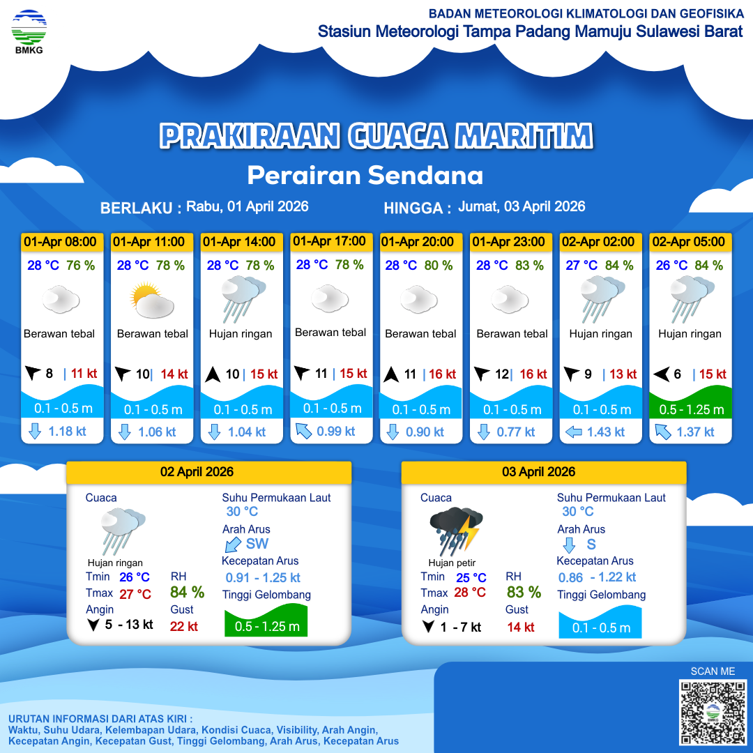 1 Apr 26, 03.00 15 jam yang lalu | Cerah Berawan | Barat 6 kt Gust Peningkatan kecepatan angin yang singkat dan tiba-tiba : 14 kt | | | 28 °C | 78 % |
