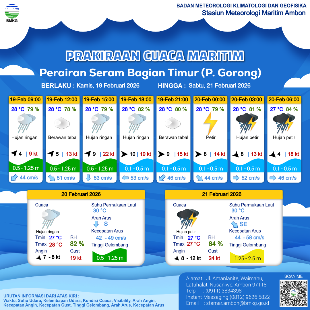 19 Feb 26, 13.00 4 jam kedepan | Barat 9 kt Gust Peningkatan kecepatan angin yang singkat dan tiba-tiba : 15 kt | 0.5 m Rendah | Selatan 44.0 cm/s | 28 °C | 80 % | |