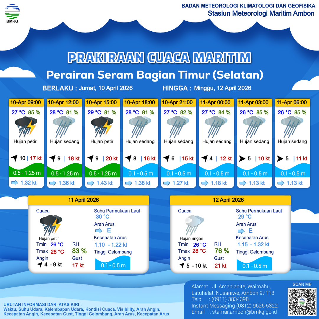 10 Apr 26, 12.00 12 jam kedepan | Barat Daya 6 kt Gust Peningkatan kecepatan angin yang singkat dan tiba-tiba : 15 kt | 0.5 m Rendah | Timur 1.3 Knots | 27 °C | 82 % | |