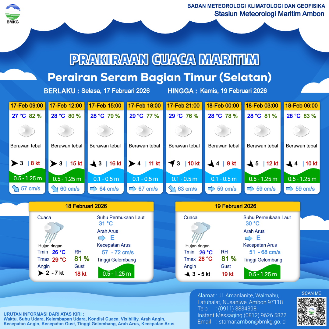 17 Feb 26, 16.00 2 jam kedepan | Barat Laut 4 kt Gust Peningkatan kecepatan angin yang singkat dan tiba-tiba : 12 kt | 0.5 m Rendah | Timur 58.0 cm/s | 28 °C | 80 % | |
