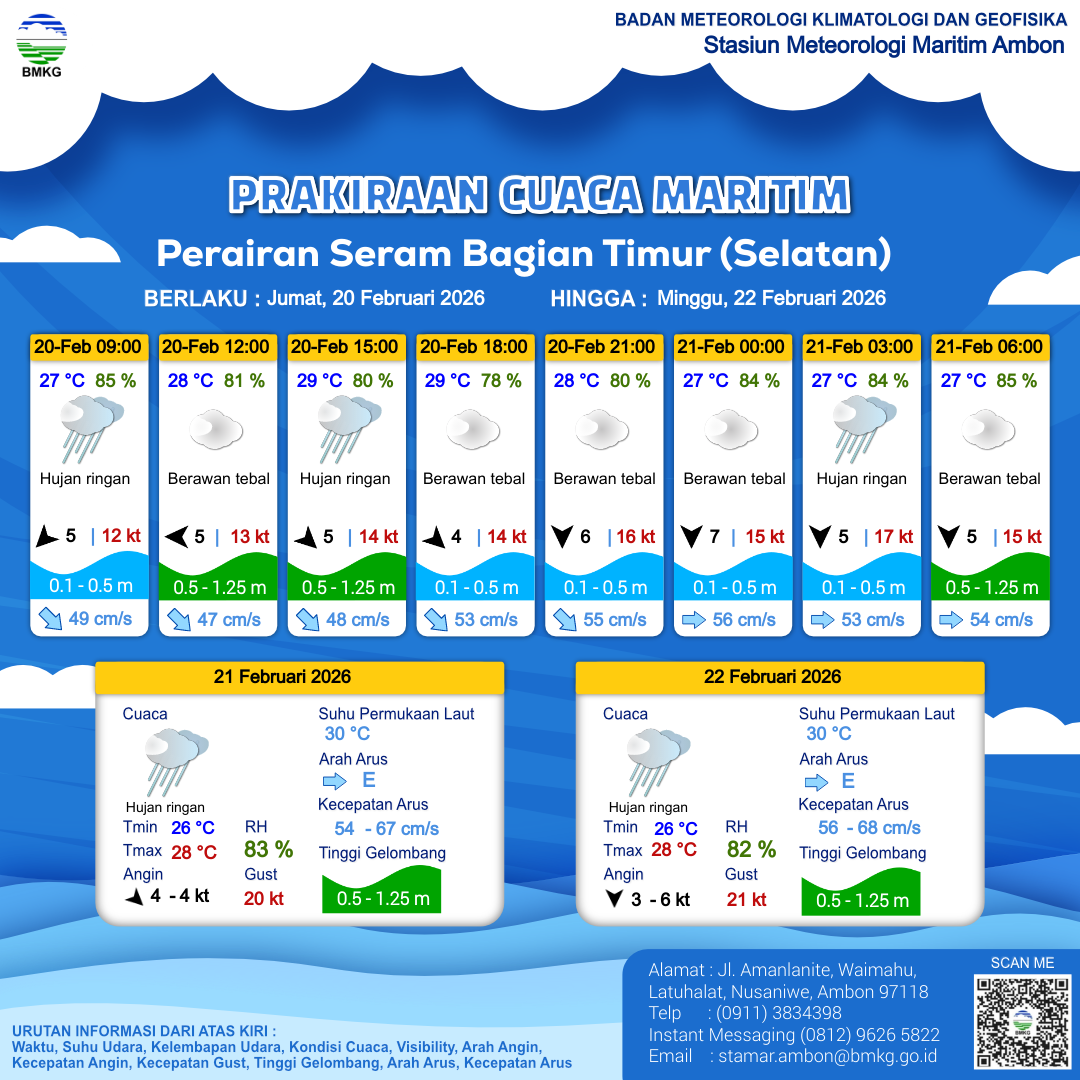 20 Feb 26, 17.00 3 jam kedepan | Utara 5 kt Gust Peningkatan kecepatan angin yang singkat dan tiba-tiba : 15 kt | 0.4 m Tenang | Timur 54.0 cm/s | 27 °C | 84 % | |