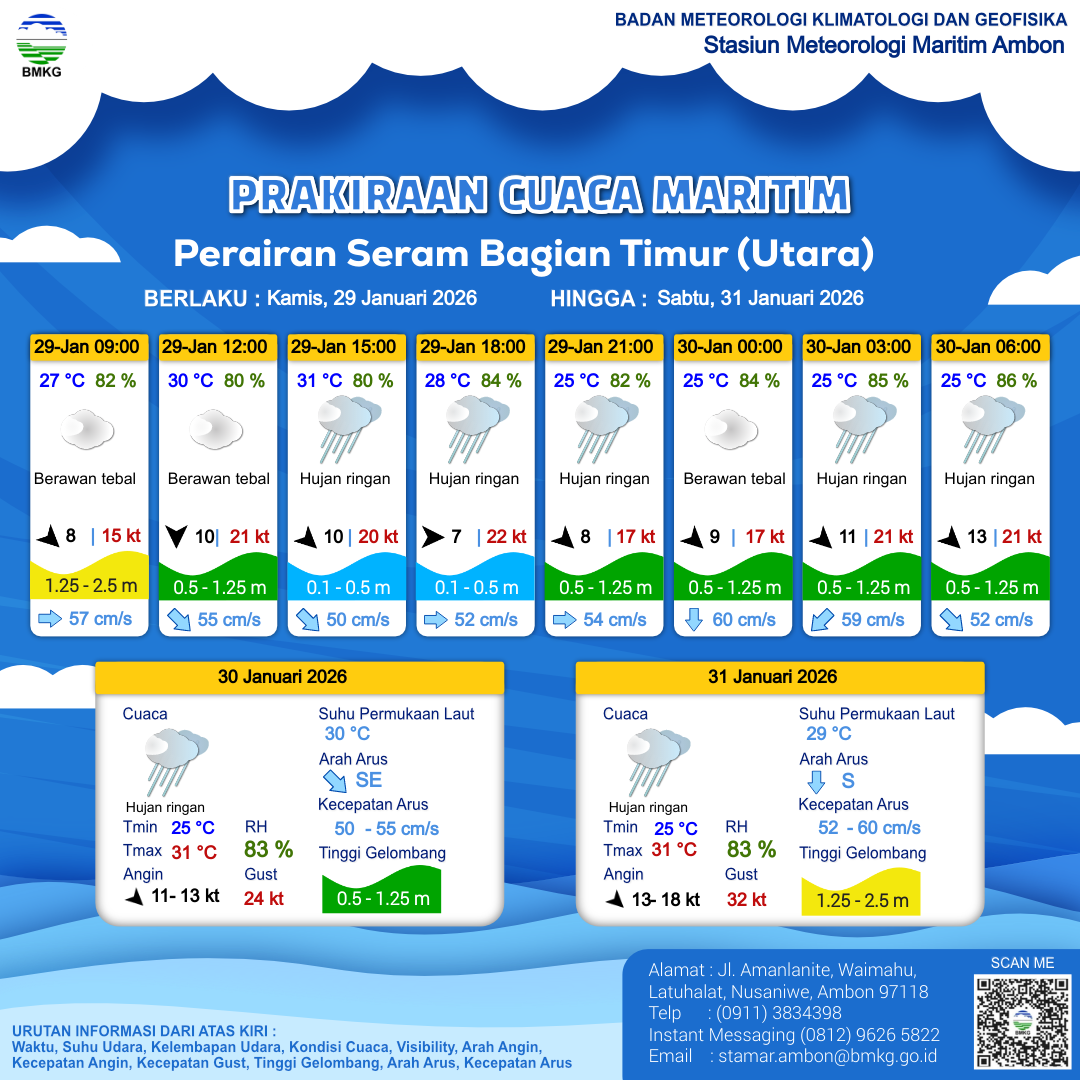 29 Jan 26, 06.00 4 jam kedepan | Barat Laut 10 kt Gust Peningkatan kecepatan angin yang singkat dan tiba-tiba : 20 kt | 0.4 m Tenang | Tenggara 50.0 cm/s | 31 °C | 80 % | |