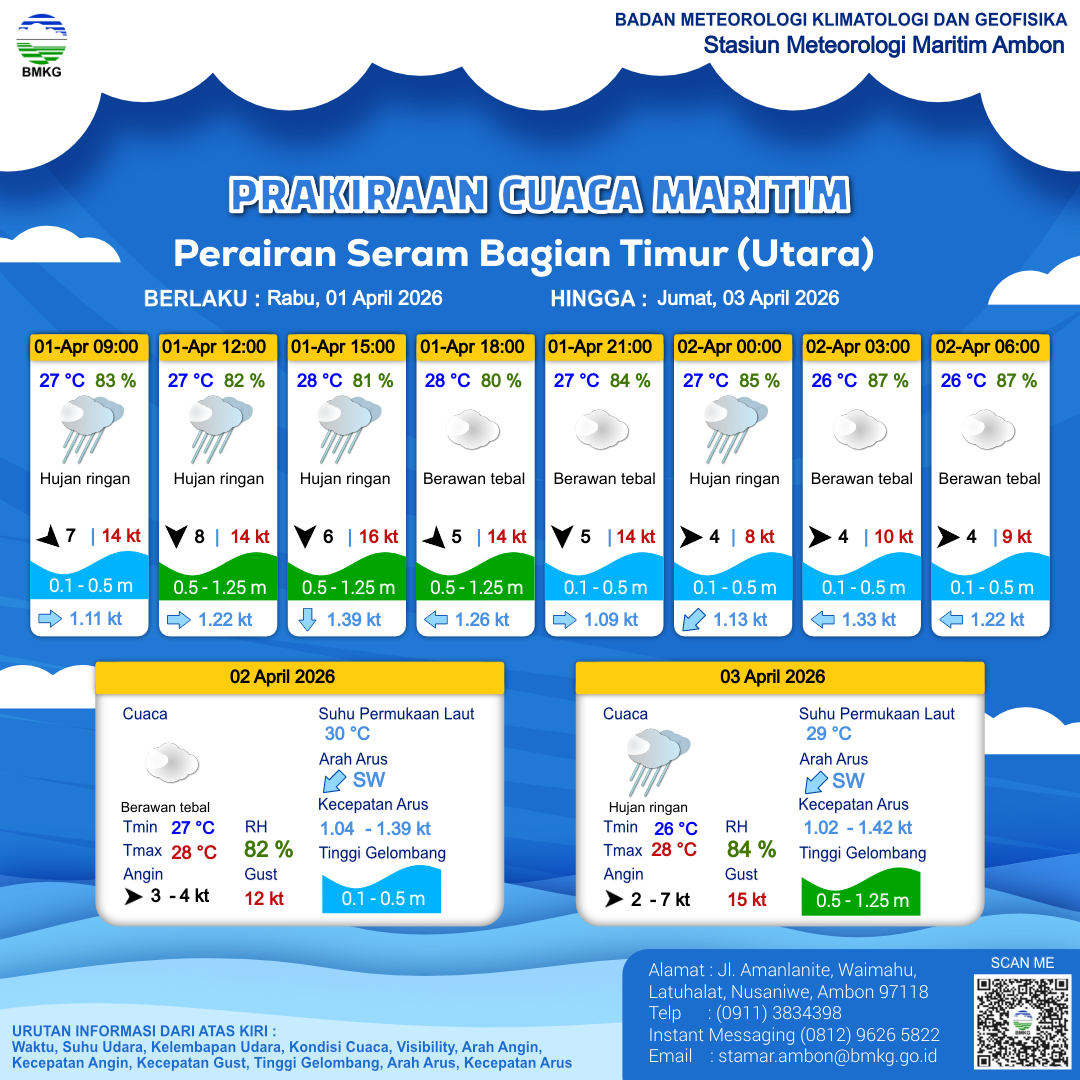 1 Apr 26, 03.00 3 jam kedepan | Utara 8 kt Gust Peningkatan kecepatan angin yang singkat dan tiba-tiba : 14 kt | 0.6 m Rendah | Timur 1.2 Knots | 27 °C | 82 % | |