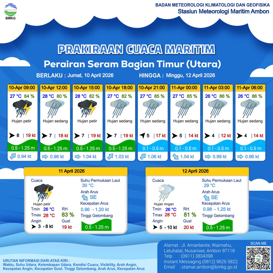 10 Apr 26, 13.00 7 jam yang lalu | Hujan Sedang | Barat Daya 5 kt Gust Peningkatan kecepatan angin yang singkat dan tiba-tiba : 15 kt | | | 27 °C | 85 % |