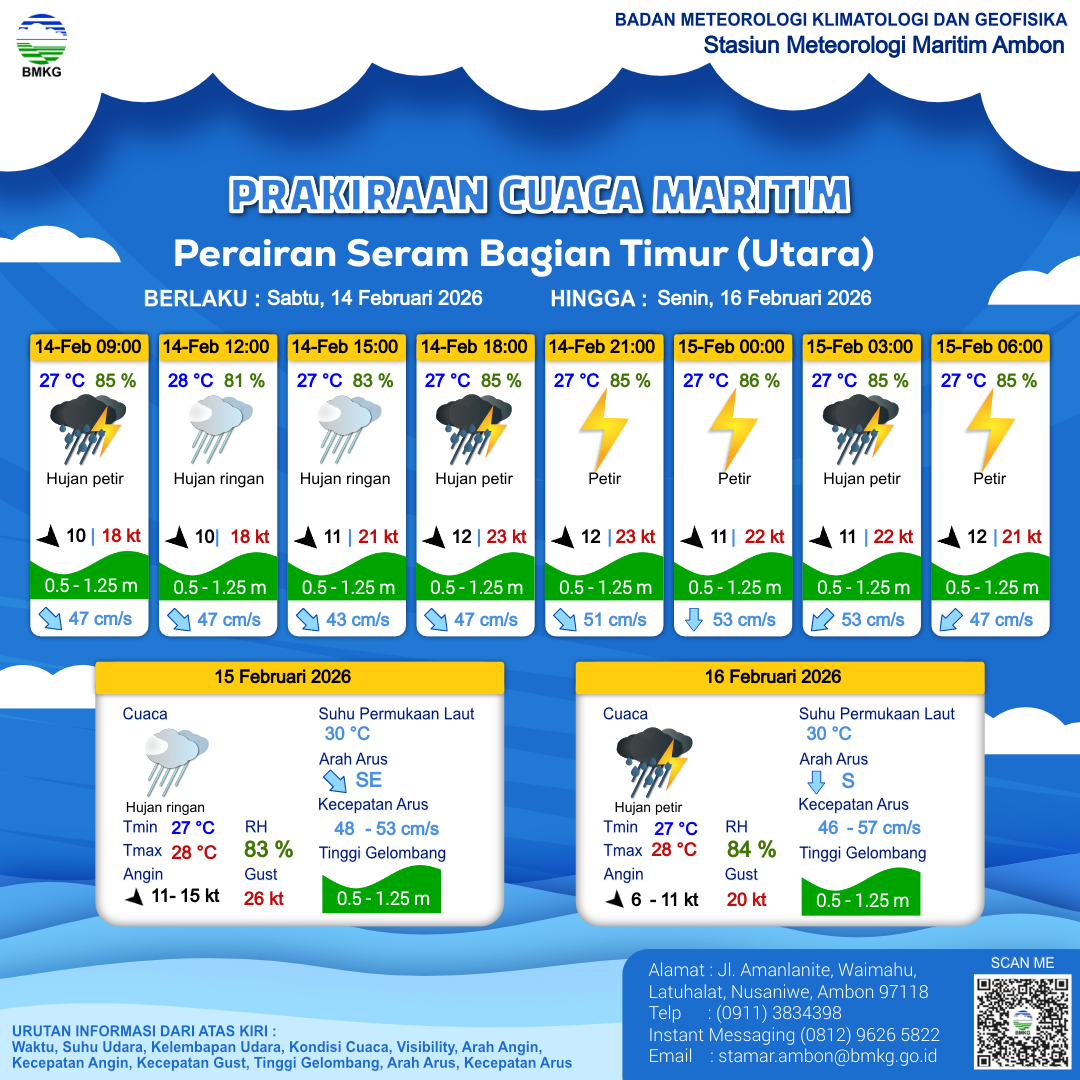 13 Feb 26, 18.00 2 jam yang lalu | Hujan Petir | Barat Laut 8 kt Gust Peningkatan kecepatan angin yang singkat dan tiba-tiba : 19 kt | | | 25 °C | 86 % |