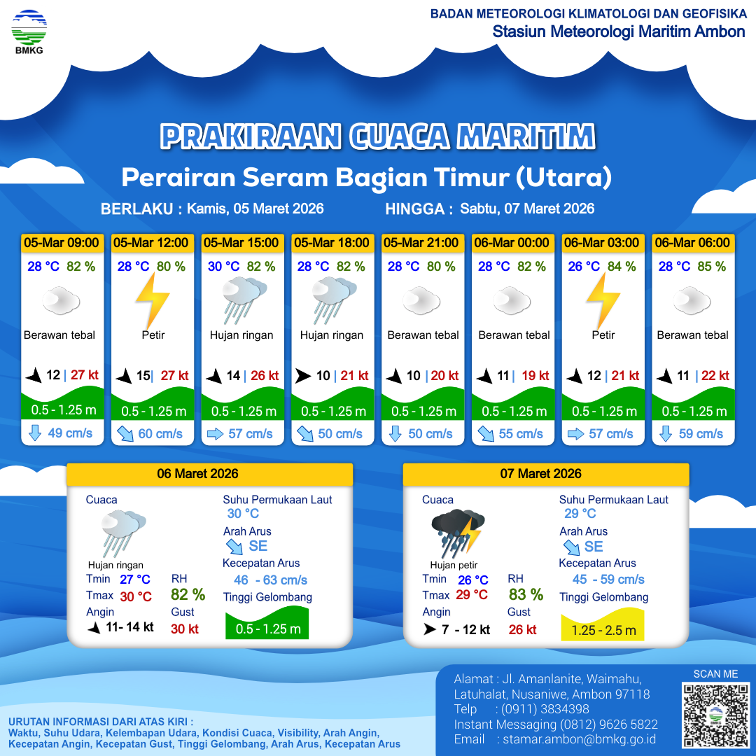 5 Mar 26, 14.00 2 jam kedepan | Barat Laut 11 kt Gust Peningkatan kecepatan angin yang singkat dan tiba-tiba : 19 kt | 0.9 m Rendah | Selatan 54.0 cm/s | 28 °C | 81 % | |