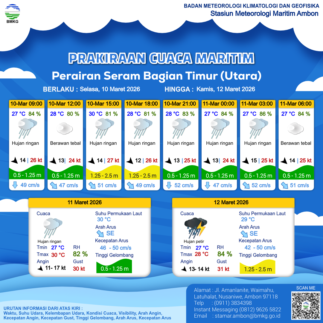 10 Mar 26, 10.00 12 jam kedepan | Barat Laut 12 kt Gust Peningkatan kecepatan angin yang singkat dan tiba-tiba : 25 kt | 1.3 m Sedang | Tenggara 51.0 cm/s | 28 °C | 82 % | |