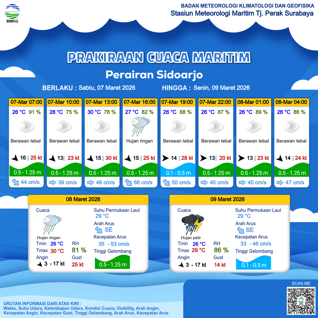 6 Mar 26, 14.00 8 jam yang lalu | Berawan Tebal | Barat 14 kt Gust Peningkatan kecepatan angin yang singkat dan tiba-tiba : 26 kt | | | 26 °C | 86 % |
