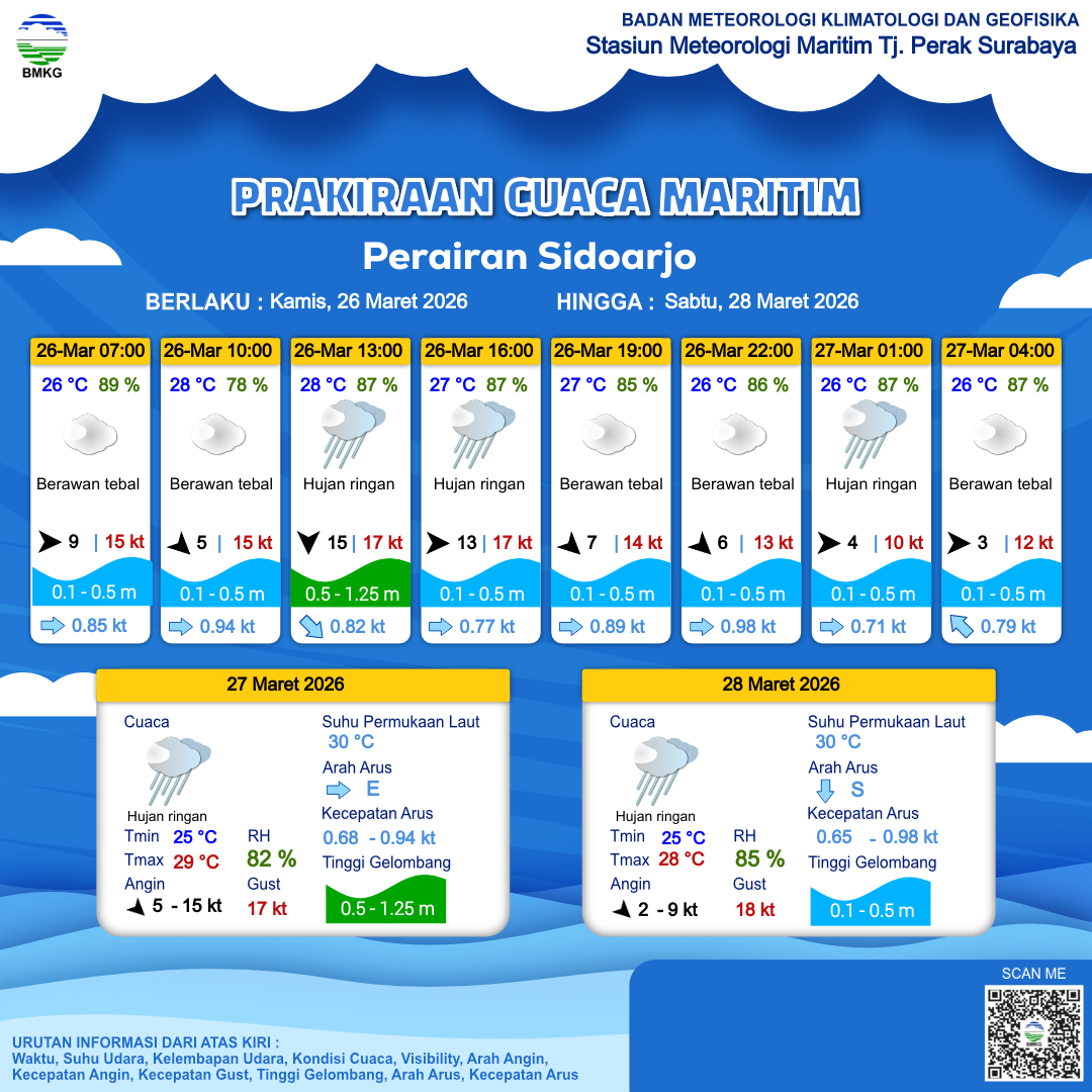 26 Mar 26, 09.00 2 jam kedepan | Barat 13 kt Gust Peningkatan kecepatan angin yang singkat dan tiba-tiba : 17 kt | 0.3 m Tenang | Timur 0.8 Knots | 27 °C | 87 % | |