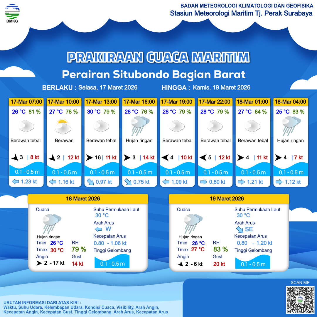 17 Mar 26, 15.00 3 jam kedepan | Timur 5 kt Gust Peningkatan kecepatan angin yang singkat dan tiba-tiba : 12 kt | 0.5 m Rendah | Timur 0.8 Knots | 28 °C | 79 % | |