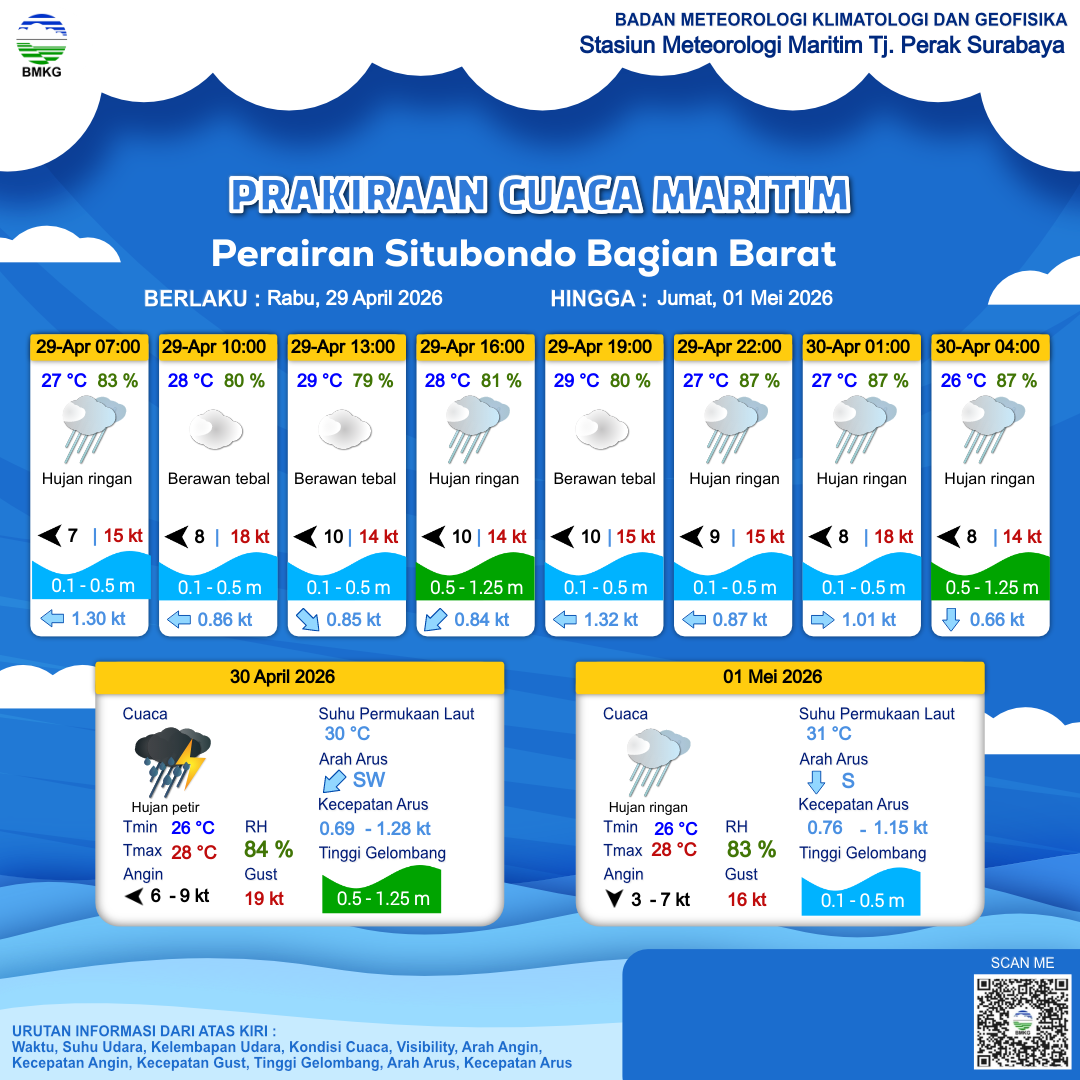 28 Apr 26, 22.00 4 jam kedepan | Hujan Ringan | Timur 7 kt Gust Peningkatan kecepatan angin yang singkat dan tiba-tiba : 14 kt | | | 27 °C | 85 % |