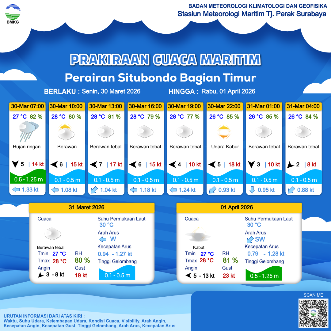 30 Mar 26, 02.00 3 jam kedepan | Timur 6 kt Gust Peningkatan kecepatan angin yang singkat dan tiba-tiba : 12 kt | 0.5 m Rendah | Barat 1.2 Knots | 27 °C | 80 % | |