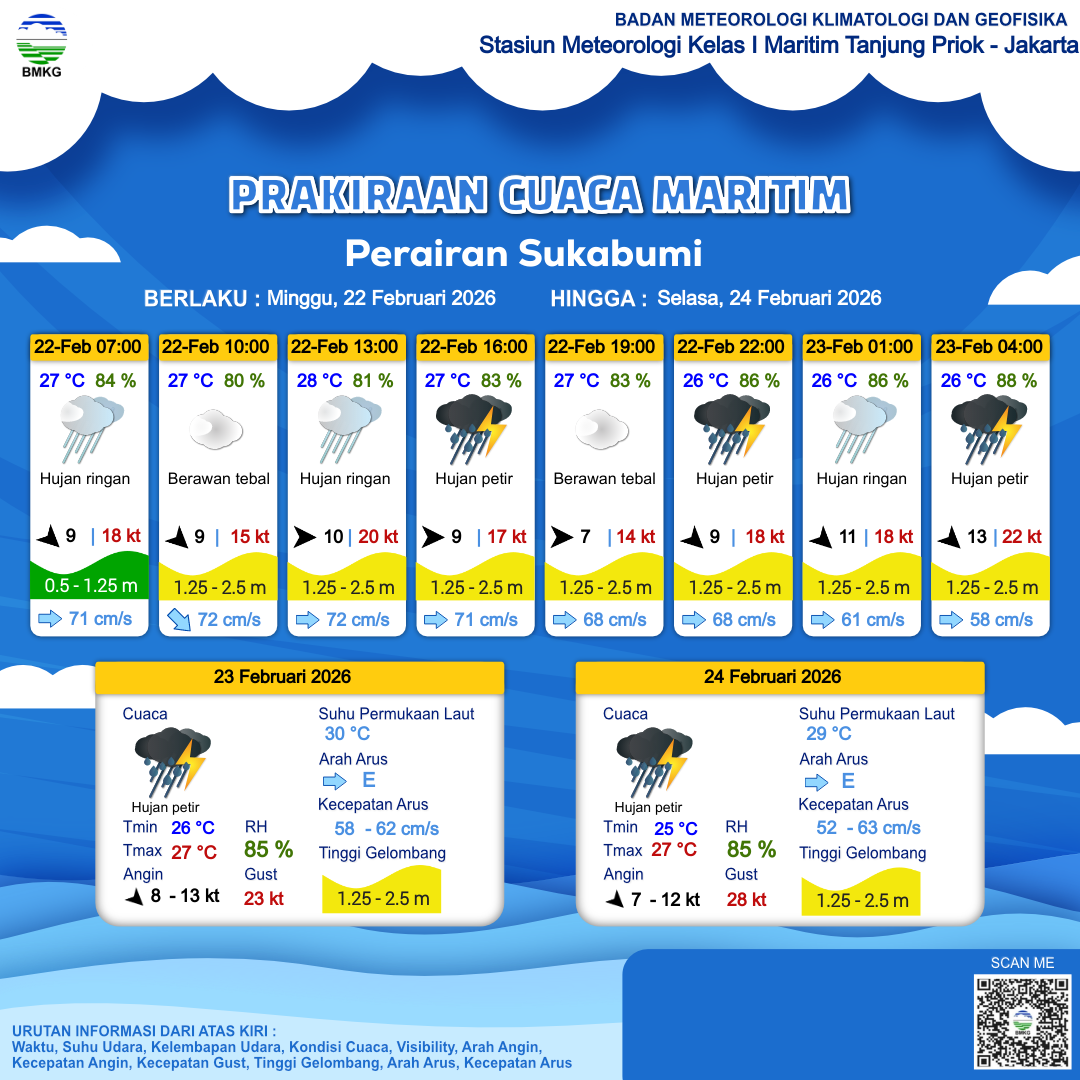 22 Feb 26, 23.00 5 jam kedepan | Barat Laut 9 kt Gust Peningkatan kecepatan angin yang singkat dan tiba-tiba : 18 kt | 1.4 m Sedang | Timur 58.0 cm/s | 26 °C | 88 % |