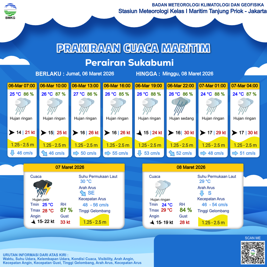 5 Mar 26, 23.00 4 jam kedepan | Hujan Ringan | Barat 13 kt Gust Peningkatan kecepatan angin yang singkat dan tiba-tiba : 24 kt | | | 25 °C | 87 % |