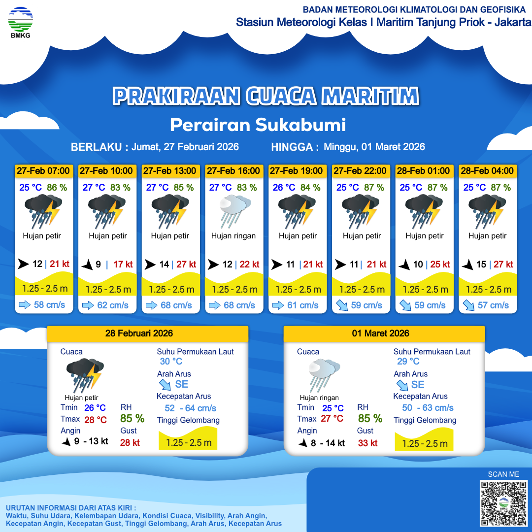 27 Feb 26, 17.00 5 jam yang lalu | Hujan Petir | Barat Laut 10 kt Gust Peningkatan kecepatan angin yang singkat dan tiba-tiba : 25 kt | | | 25 °C | 86 % |