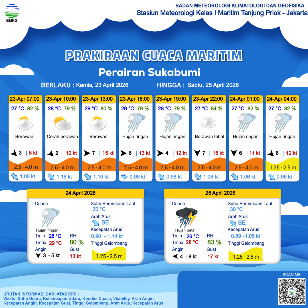 23 Apr 26, 13.00 2 jam kedepan | Barat 4 kt Gust Peningkatan kecepatan angin yang singkat dan tiba-tiba : 13 kt | 2.7 m Tinggi | Tenggara 1.0 Knots | 27 °C | 80 % | |