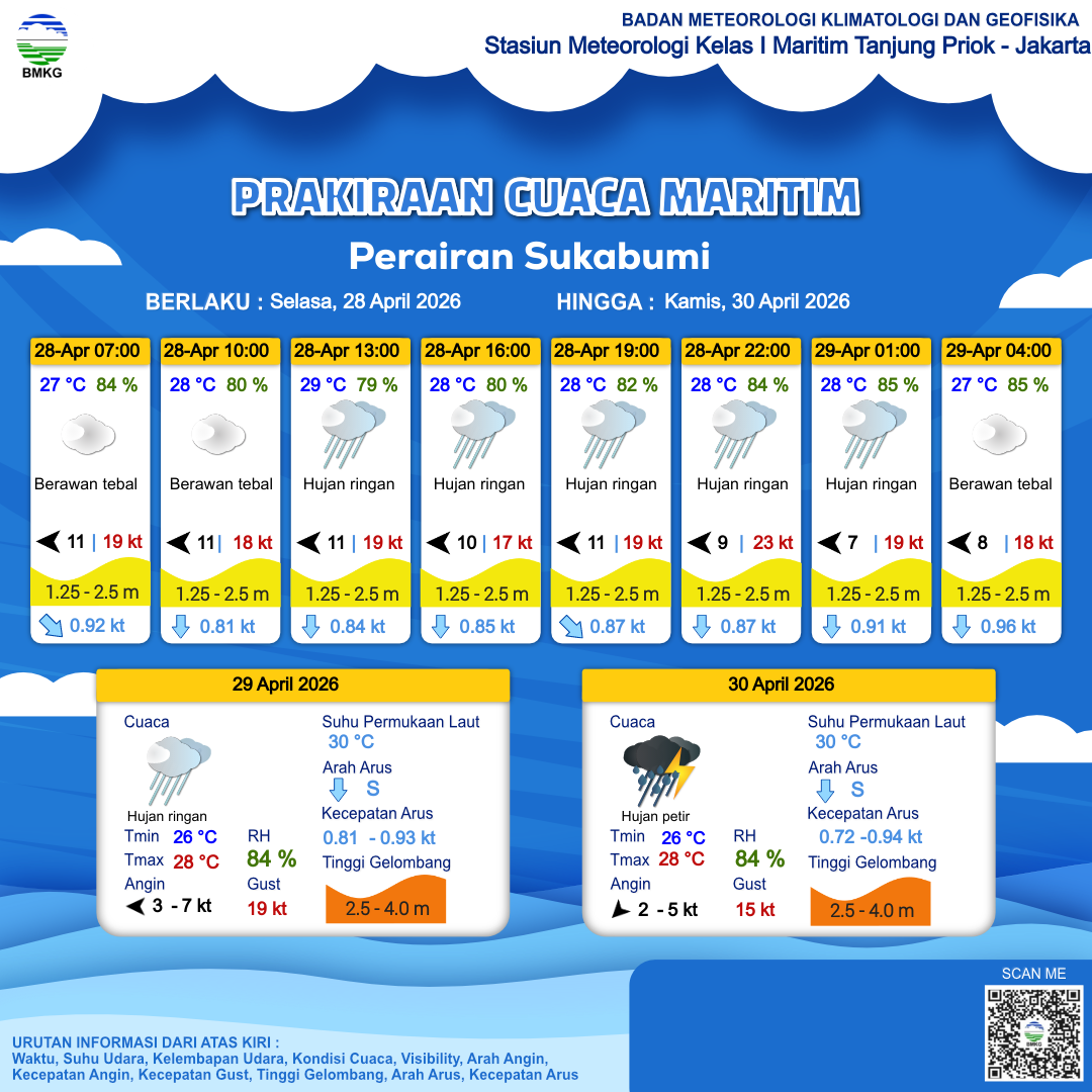 27 Apr 26, 18.00 17 jam kedepan | Timur 8 kt Gust Peningkatan kecepatan angin yang singkat dan tiba-tiba : 17 kt | 2.5 m Tinggi | Selatan 0.9 Knots | 28 °C | 84 % | |