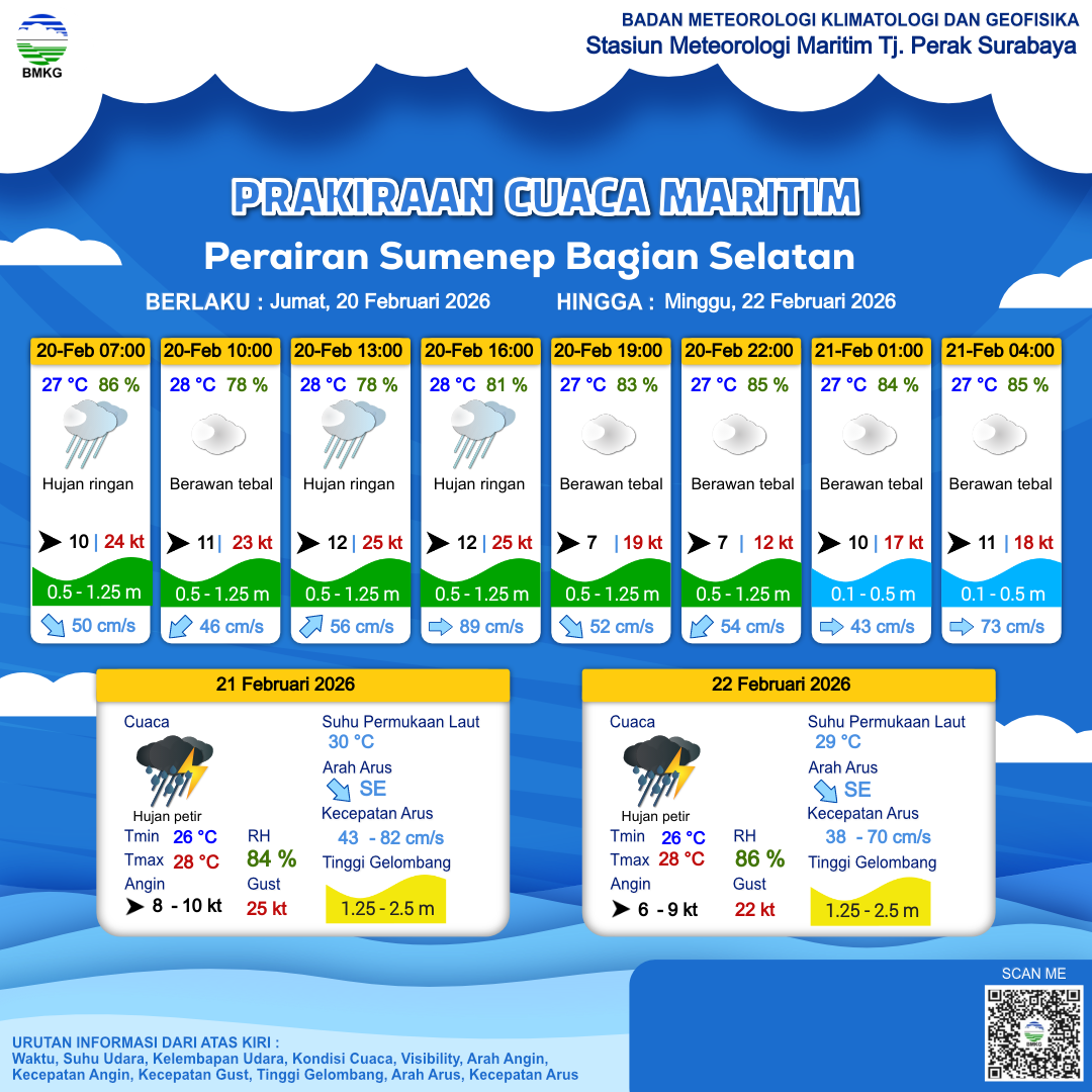 20 Feb 26, 09.00 3 jam kedepan | Barat 12 kt Gust Peningkatan kecepatan angin yang singkat dan tiba-tiba : 25 kt | 0.7 m Rendah | Timur 89.0 cm/s | 28 °C | 81 % | |