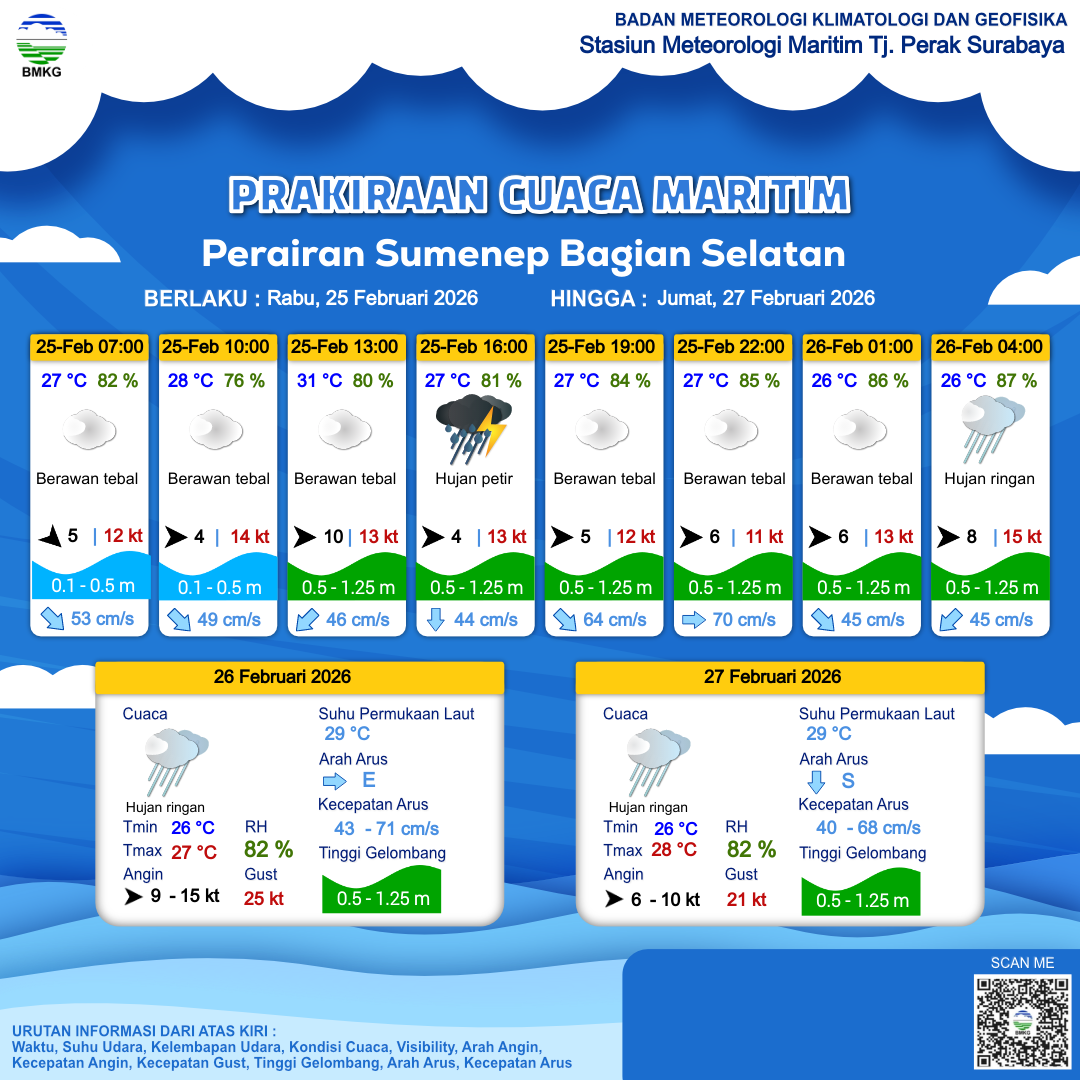25 Feb 26, 23.00 4 jam kedepan | Hujan Ringan | Barat 9 kt Gust Peningkatan kecepatan angin yang singkat dan tiba-tiba : 16 kt | | | 26 °C | 86 % |