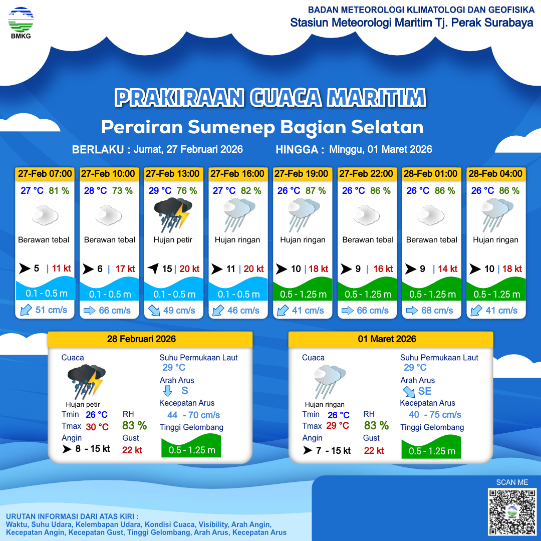 27 Feb 26, 06.00 15 jam yang lalu | Hujan Petir | Barat Daya 15 kt Gust Peningkatan kecepatan angin yang singkat dan tiba-tiba : 20 kt | | | 29 °C | 76 % |