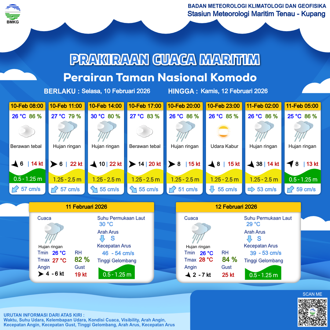 10 Feb 26, 23.00 9 jam kedepan | Barat Daya 8 kt Gust Peningkatan kecepatan angin yang singkat dan tiba-tiba : 12 kt | 1.2 m Rendah | Barat Daya 51.0 cm/s | 26 °C | 85 % |