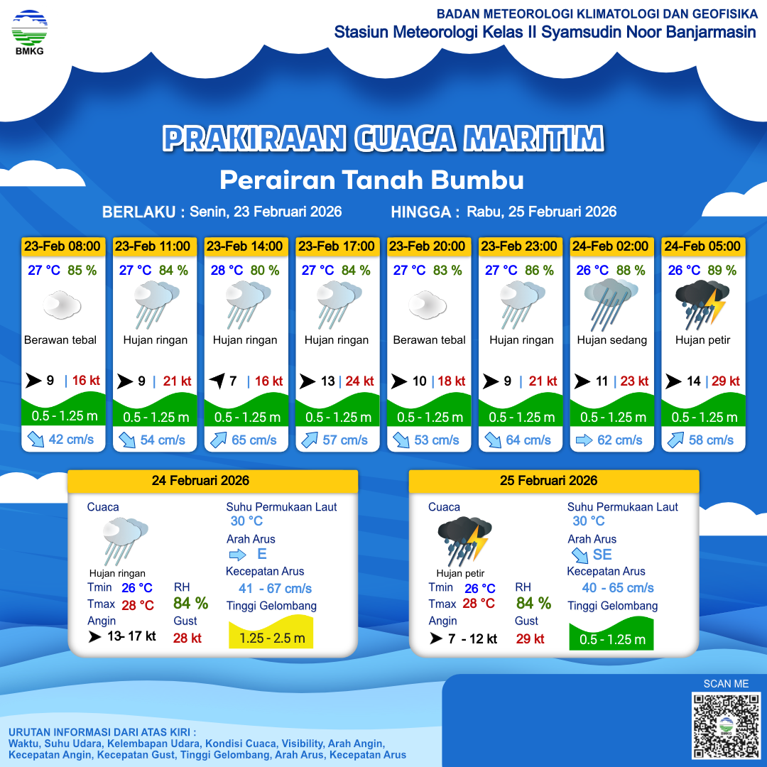 23 Feb 26, 23.00 4 jam kedepan | Hujan Ringan | Barat 14 kt Gust Peningkatan kecepatan angin yang singkat dan tiba-tiba : 28 kt | | | 26 °C | 88 % |