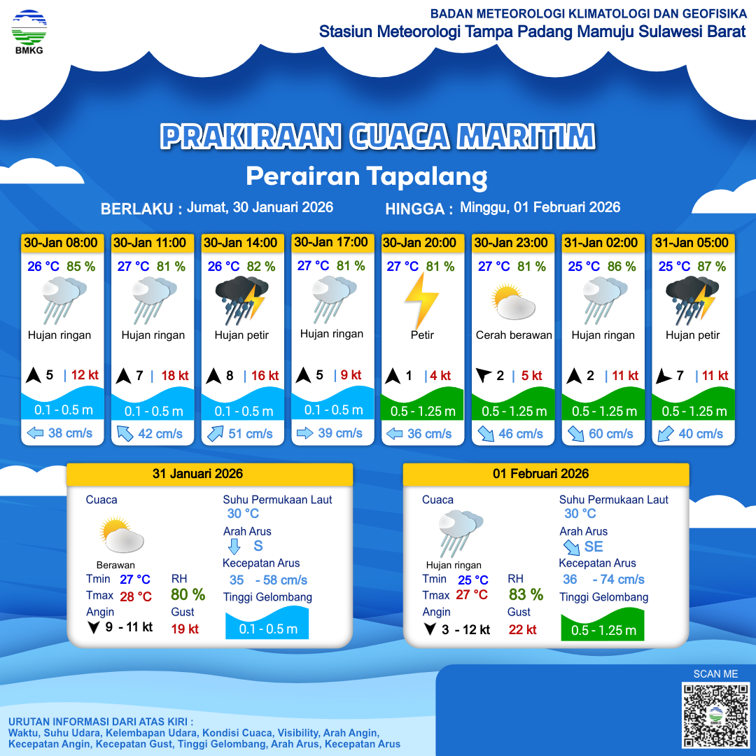 29 Jan 26, 23.00 2 jam kedepan | Hujan Ringan | Utara 6 kt Gust Peningkatan kecepatan angin yang singkat dan tiba-tiba : 10 kt | | | 25 °C | 87 % |