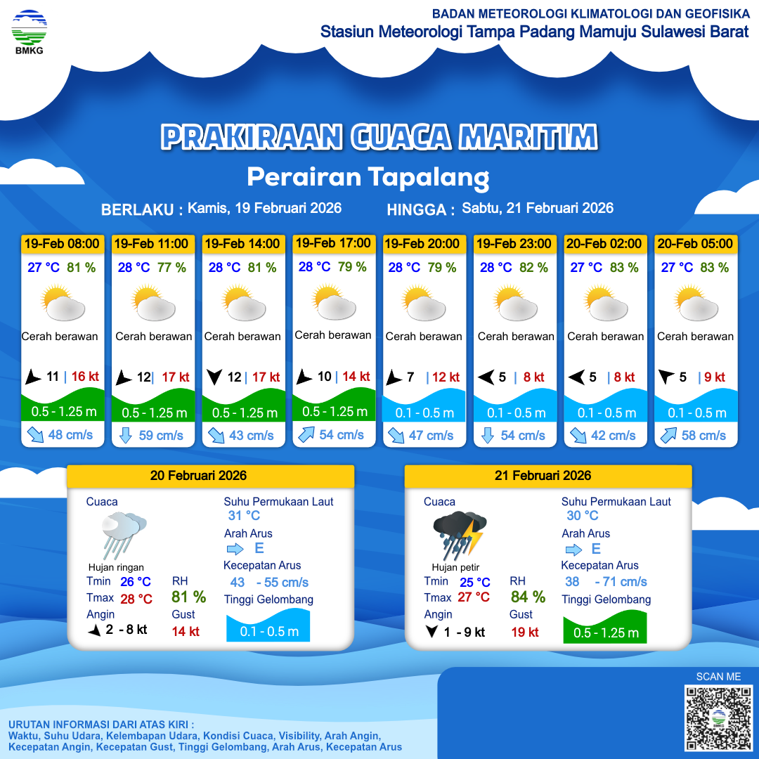 19 Feb 26, 15.00 3 jam kedepan | Timur Laut 4 kt Gust Peningkatan kecepatan angin yang singkat dan tiba-tiba : 8 kt | 0.4 m Tenang | Selatan 54.0 cm/s | 28 °C | 82 % | |