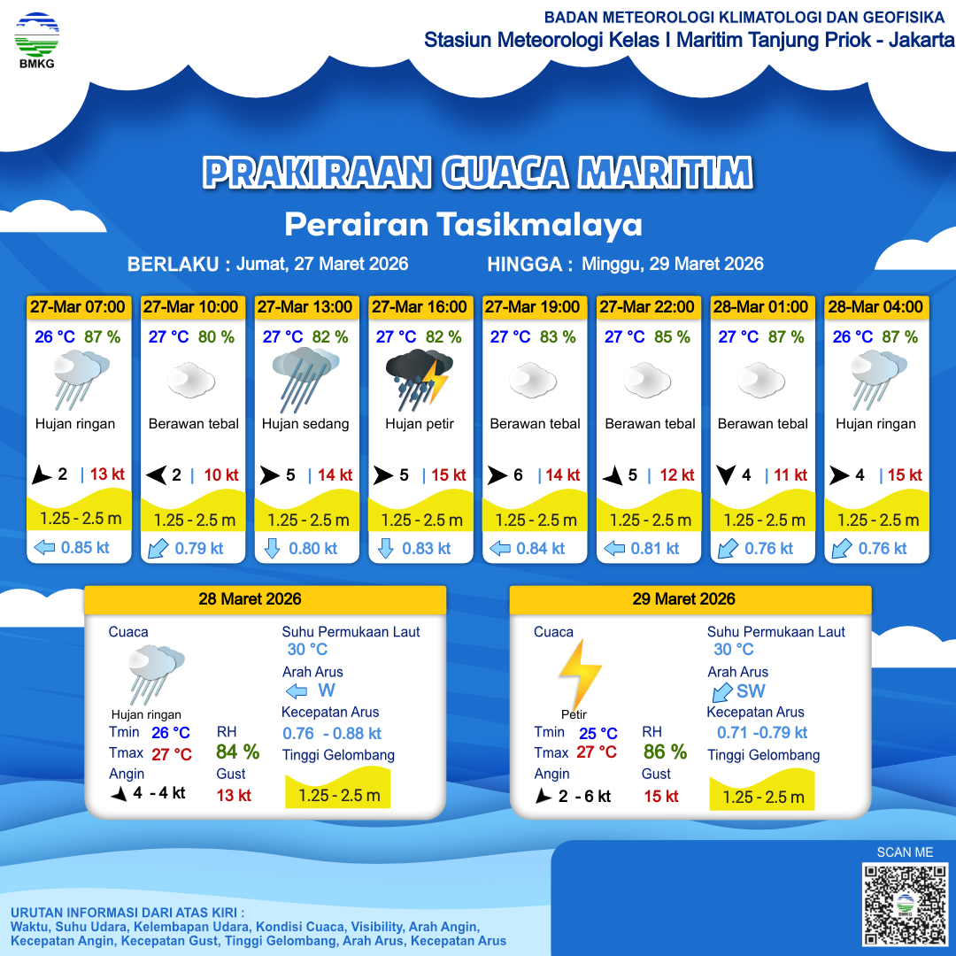 27 Mar 26, 06.00 4 jam kedepan | Barat 5 kt Gust Peningkatan kecepatan angin yang singkat dan tiba-tiba : 14 kt | 1.6 m Sedang | Selatan 0.8 Knots | 27 °C | 82 % | |