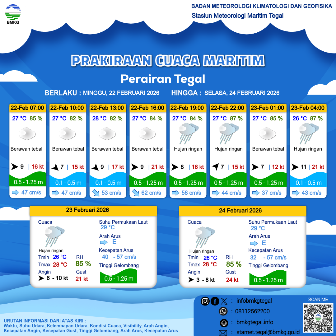 22 Feb 26, 21.00 3 jam kedepan | Hujan Ringan | Barat 11 kt Gust Peningkatan kecepatan angin yang singkat dan tiba-tiba : 21 kt | | | 26 °C | 87 % |