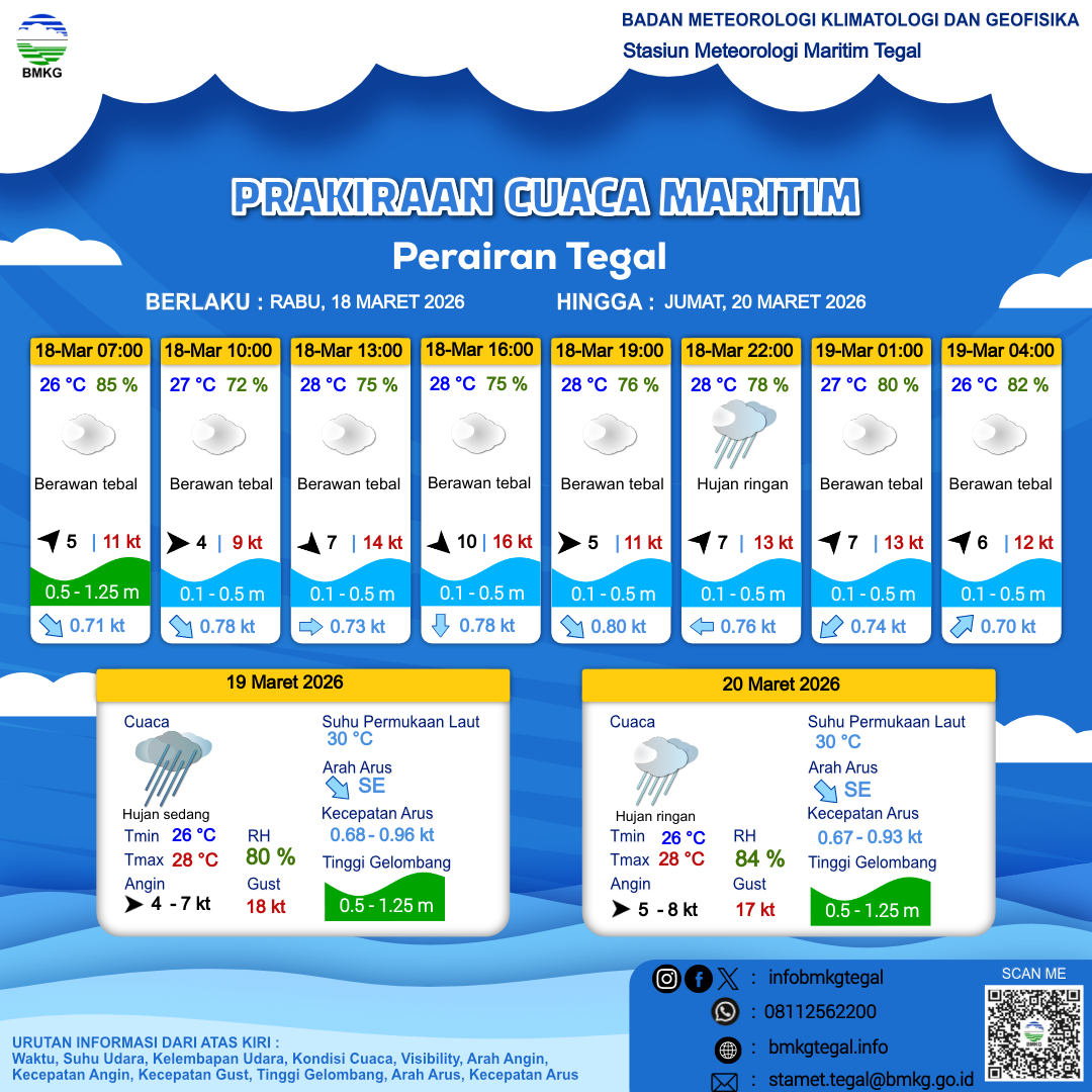 18 Mar 26, 11.00 12 jam kedepan | Barat 5 kt Gust Peningkatan kecepatan angin yang singkat dan tiba-tiba : 13 kt | 0.4 m Tenang | Barat Daya 0.8 Knots | 28 °C | 76 % | |