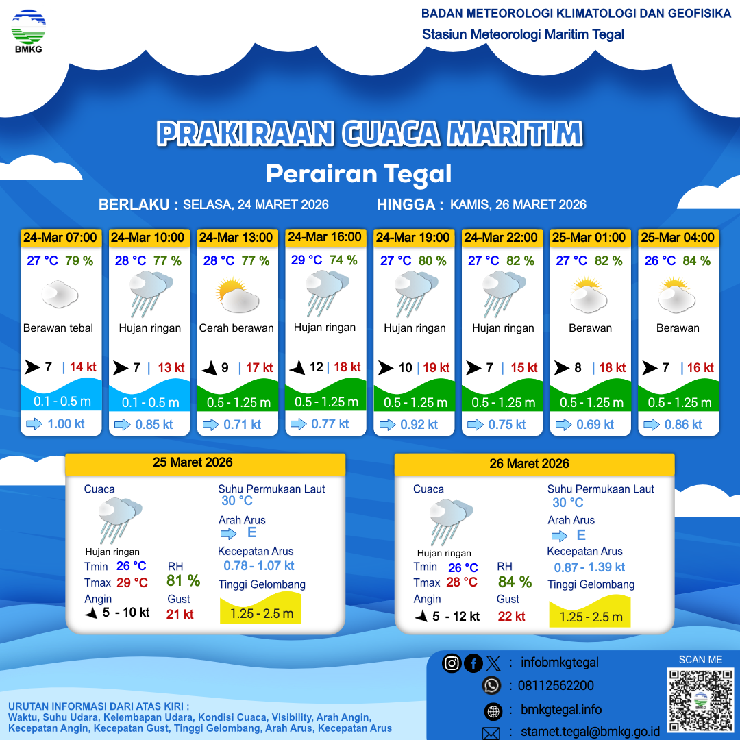 24 Mar 26, 12.00 9 jam kedepan | Barat 10 kt Gust Peningkatan kecepatan angin yang singkat dan tiba-tiba : 19 kt | 1.2 m Rendah | Timur 0.9 Knots | 27 °C | 80 % | |