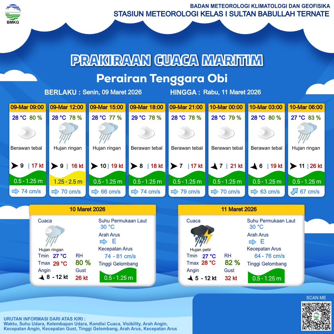 9 Mar 26, 23.00 4 jam kedepan | Hujan Ringan | Barat 12 kt Gust Peningkatan kecepatan angin yang singkat dan tiba-tiba : 30 kt | | | 27 °C | 83 % |