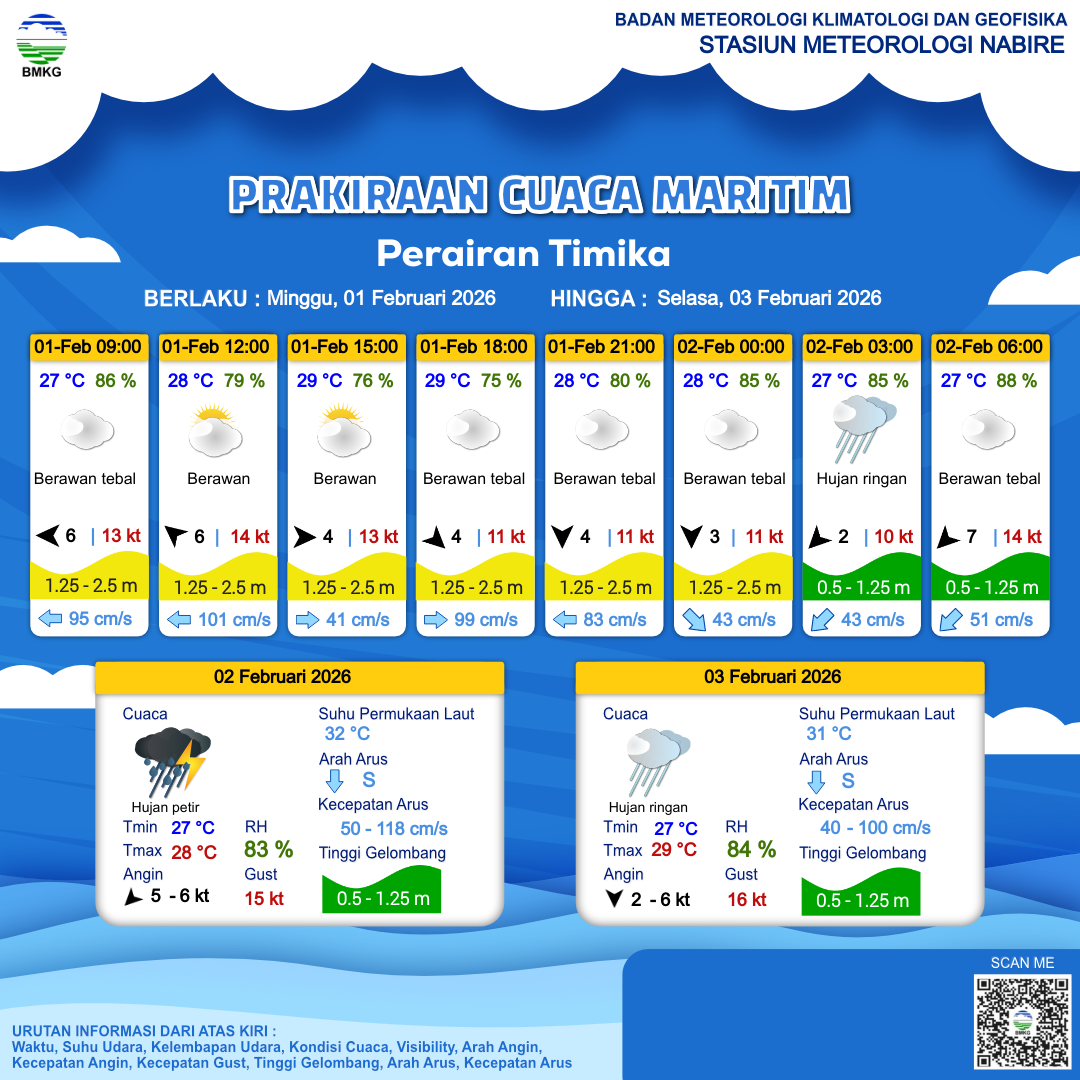1 Feb 26, 23.00 12 jam kedepan | Timur 5 kt Gust Peningkatan kecepatan angin yang singkat dan tiba-tiba : 13 kt | 1.1 m Rendah | Barat 78.0 cm/s | 27 °C | 86 % |
