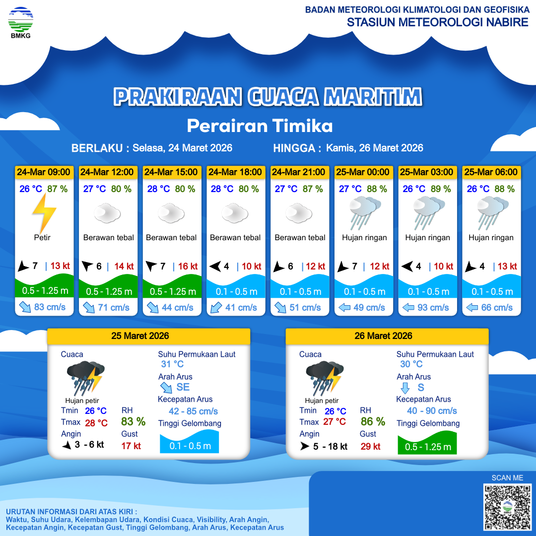 24 Mar 26, 17.00 4 jam kedepan | Timur 4 kt Gust Peningkatan kecepatan angin yang singkat dan tiba-tiba : 11 kt | 0.5 m Rendah | Barat 81.3 Knots | 26 °C | 90 % | |