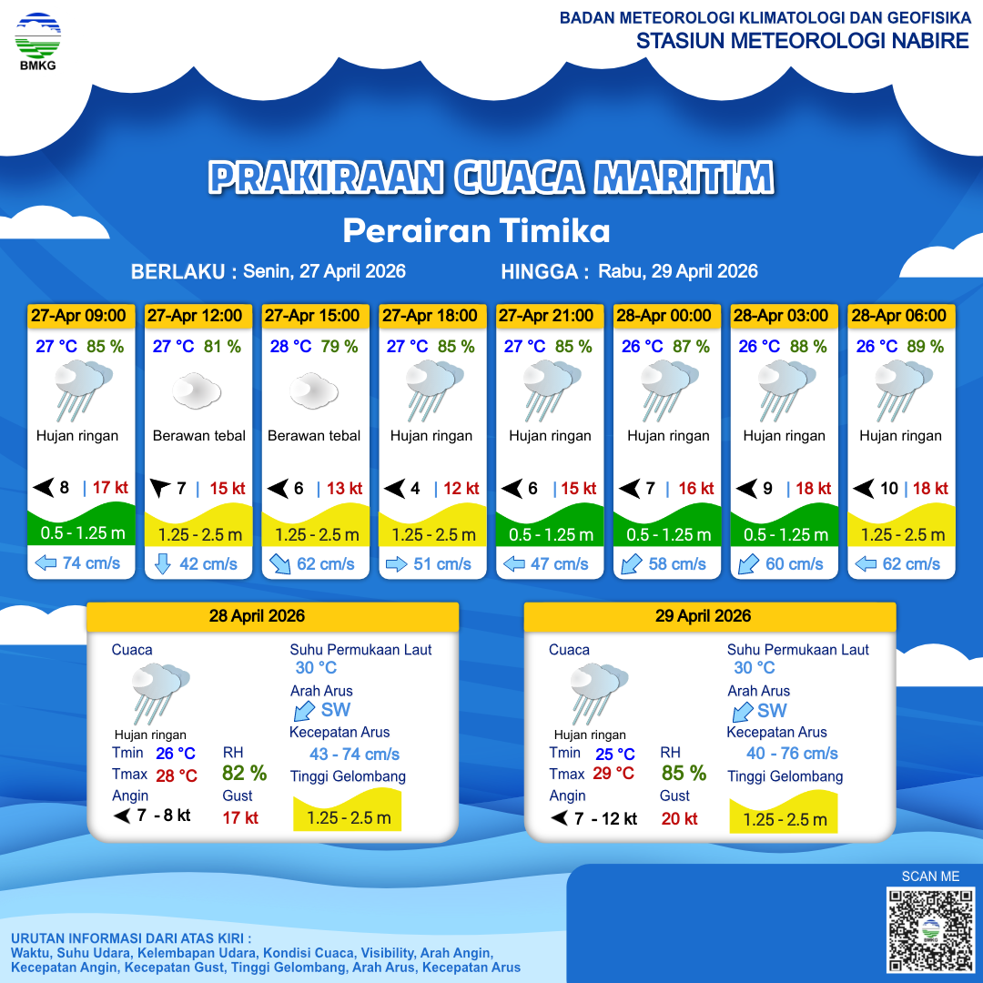 26 Apr 26, 09.00 2 jam kedepan | Timur 4 kt Gust Peningkatan kecepatan angin yang singkat dan tiba-tiba : 10 kt | 1 m Rendah | Timur 48.4 Knots | 28 °C | 80 % | |