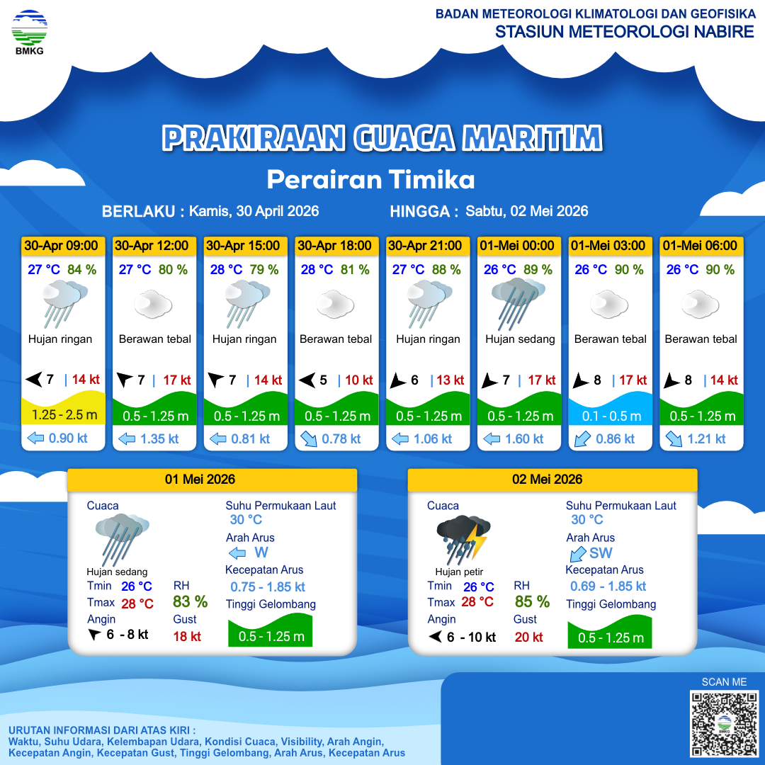 14 Apr 26, 06.00 4 jam kedepan | Barat Daya 7 kt Gust Peningkatan kecepatan angin yang singkat dan tiba-tiba : 16 kt | 0.3 m Tenang | Timur 72.0 Knots | 28 °C | 78 % | |