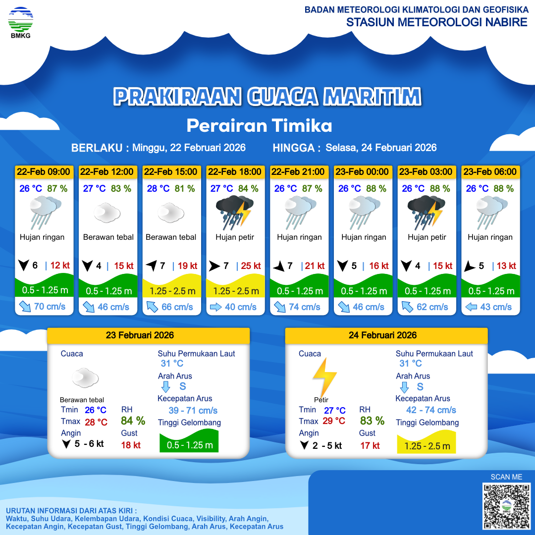 22 Feb 26, 23.00 8 jam kedepan | Timur Laut 5 kt Gust Peningkatan kecepatan angin yang singkat dan tiba-tiba : 13 kt | 1 m Rendah | Tenggara 59.0 cm/s | 26 °C | 88 % |