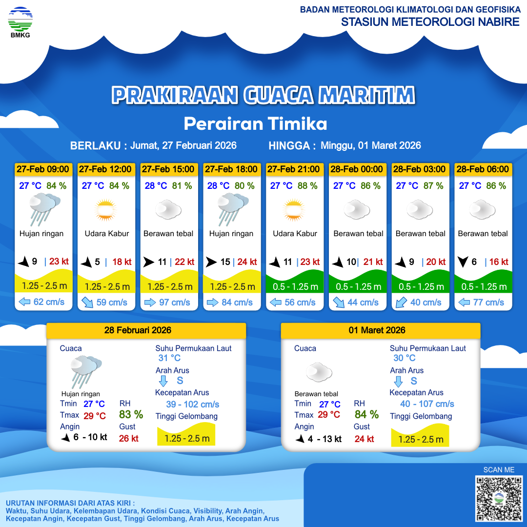 27 Feb 26, 23.00 3 jam kedepan | Berawan Tebal | Utara 6 kt Gust Peningkatan kecepatan angin yang singkat dan tiba-tiba : 12 kt | | | 27 °C | 83 % |