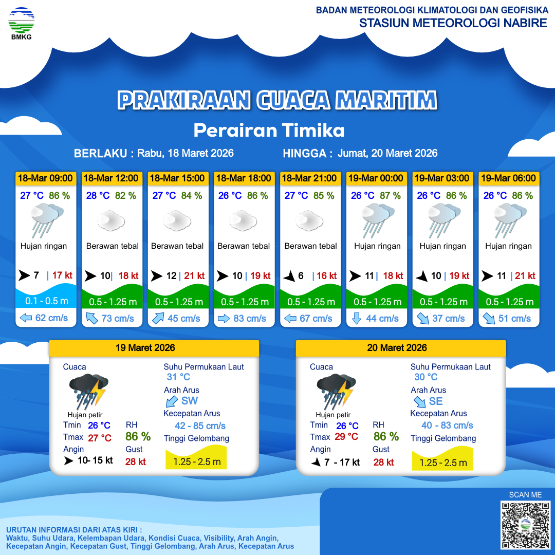 17 Mar 26, 23.00 2 jam kedepan | Hujan Ringan | Barat Laut 8 kt Gust Peningkatan kecepatan angin yang singkat dan tiba-tiba : 13 kt | | | 26 °C | 85 % |