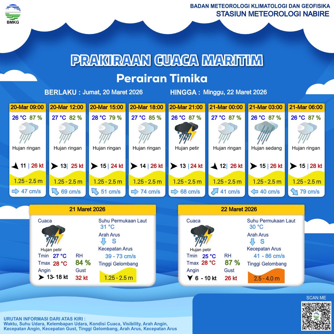 20 Mar 26, 22.00 2 jam kedepan | Hujan Ringan | Barat 15 kt Gust Peningkatan kecepatan angin yang singkat dan tiba-tiba : 28 kt | | | 27 °C | 86 % |