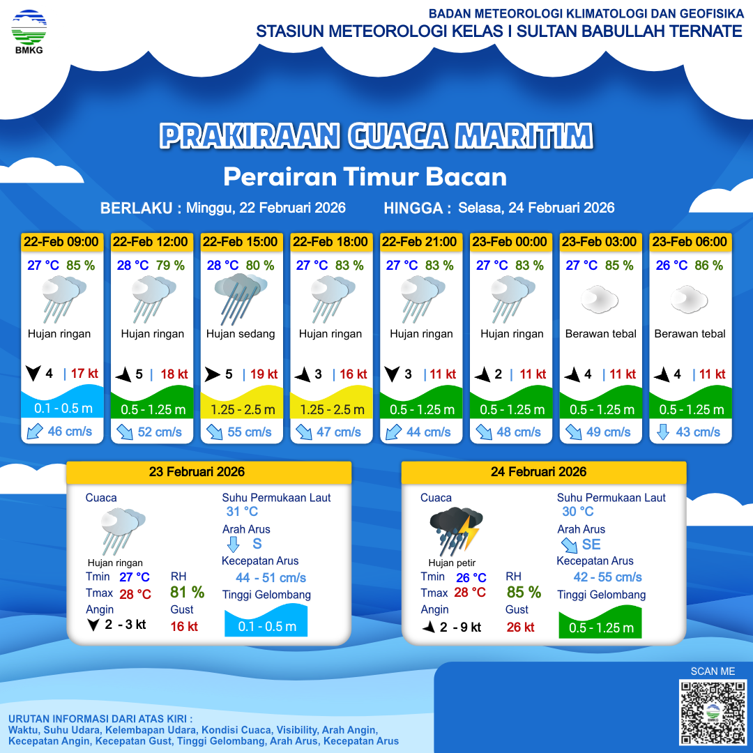 22 Feb 26, 06.00 3 jam kedepan | Barat 5 kt Gust Peningkatan kecepatan angin yang singkat dan tiba-tiba : 19 kt | 1.4 m Sedang | Tenggara 55.0 cm/s | 28 °C | 80 % | |