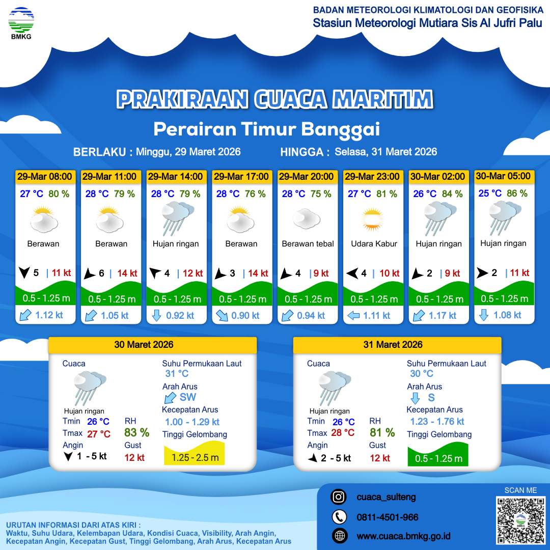 29 Mar 26, 21.00 2 jam kedepan | Hujan Ringan | Barat 2 kt Gust Peningkatan kecepatan angin yang singkat dan tiba-tiba : 11 kt | | | 25 °C | 86 % |
