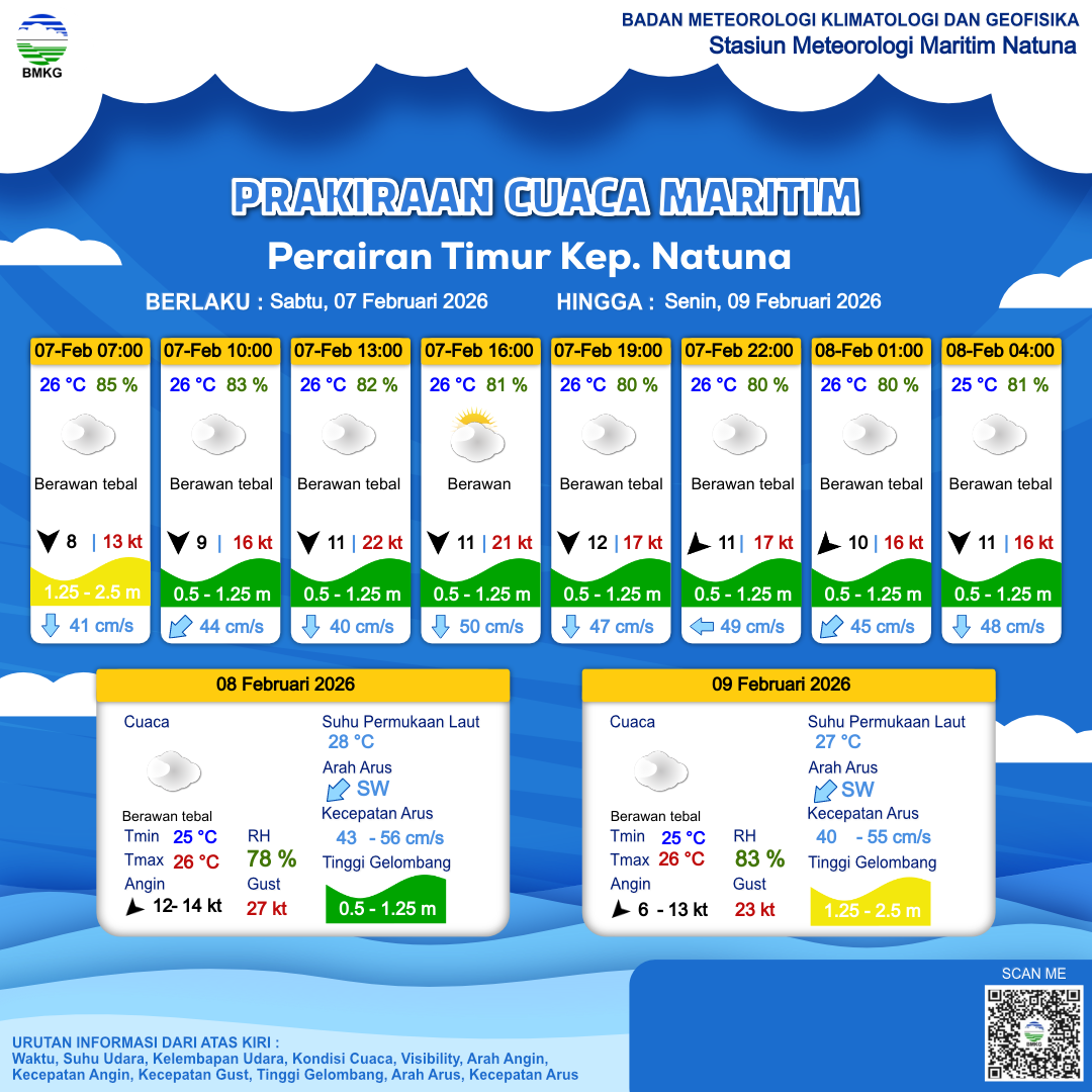 6 Feb 26, 23.00 2 jam kedepan | Berawan Tebal | Timur Laut 10 kt Gust Peningkatan kecepatan angin yang singkat dan tiba-tiba : 16 kt | | | 26 °C | 86 % |